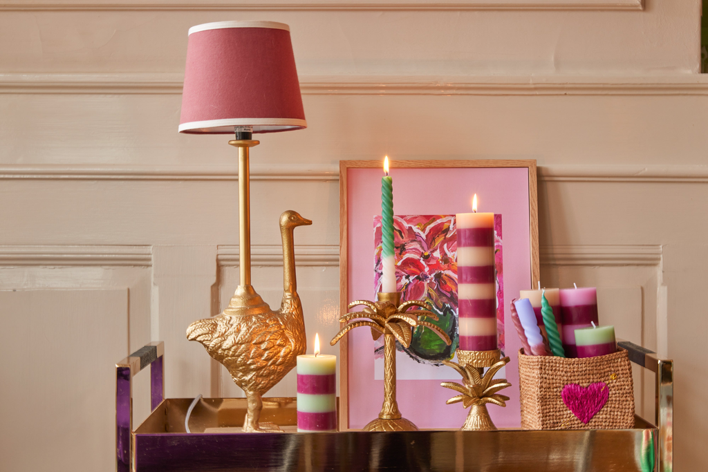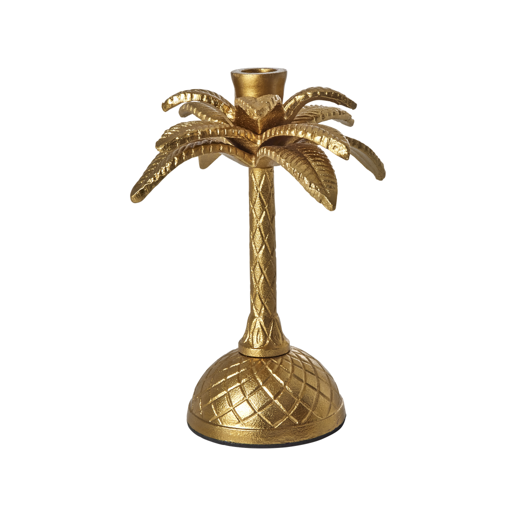 Tall and fun golden candleholder shaped like a palm tree. It is made of metal and is perfect for both a splash of color in the living room and a funky table setting!